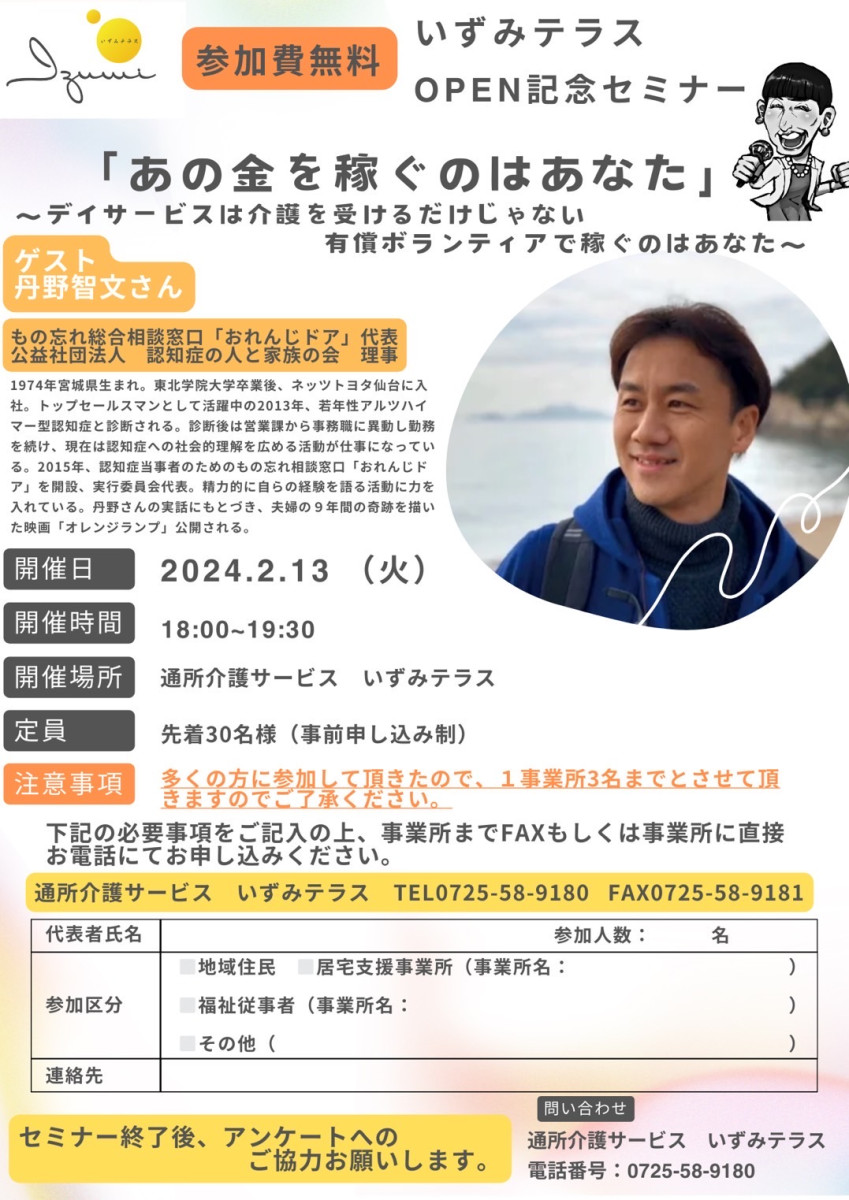 Open記念セミナーを参加費無料で開催いたします。内容は「犬も歩けば棒に当たる」は実際に見たことはないですが、「デイに通えば金が貯まる」は現実の話で、このデイサービス新時代の幕開けを『あの金を稼ぐのはあなた』と題して、ゲストに丹野智文さんをむかえ、認知症当事者として経験したお話、映画オレンジランプのお話、有償ボランティアについてのディスカッションや参加された方の質問にお応えいただけるなど、内容盛り沢山の1時間30分となっております。先着30名様で、現在8割程度埋まっておりますが、まだまだご連絡頂ければと思います!!